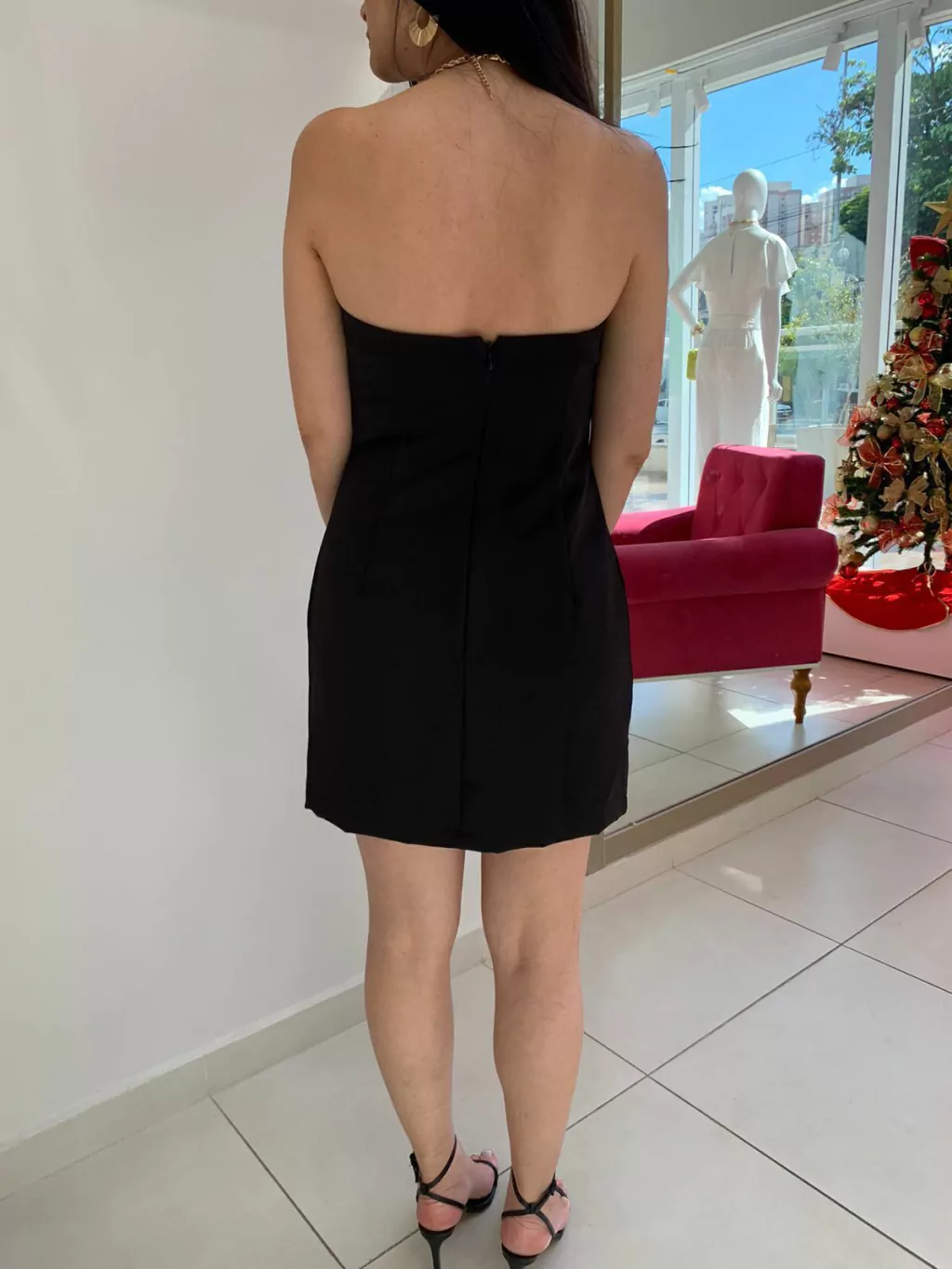 Descrição: Vestido curto com detalhes franzido no busto ; Possui zíper nas costas