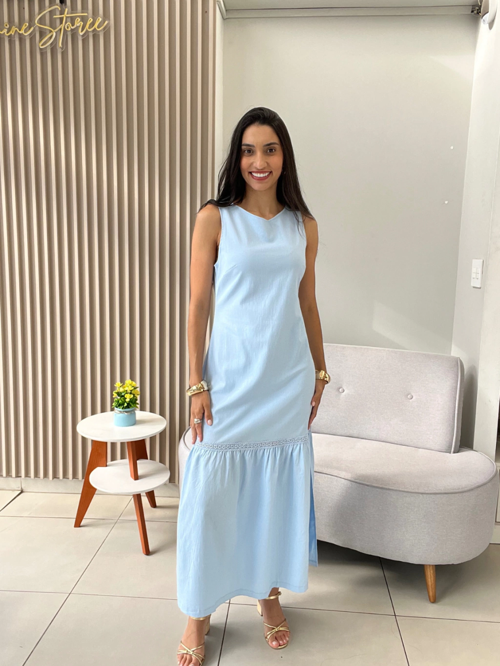 Vestido Rebeca: elegância e conforto em tecido sofisticado. Com 49,7% linho, 32,3% viscose, 16,29% algodão e 1,89% elastano, oferece caimento perfeito e toque suave. Seu corte reto e comprimento longuete trazem charme discreto, realçado pelo bordado delicado na barra e fendas laterais. Forro completo e zíper nas costas garantem conforto e praticidade. Ideal para ocasiões que vão do básico ao elegante. Ouse nos acessórios e destaque seu estilo único!