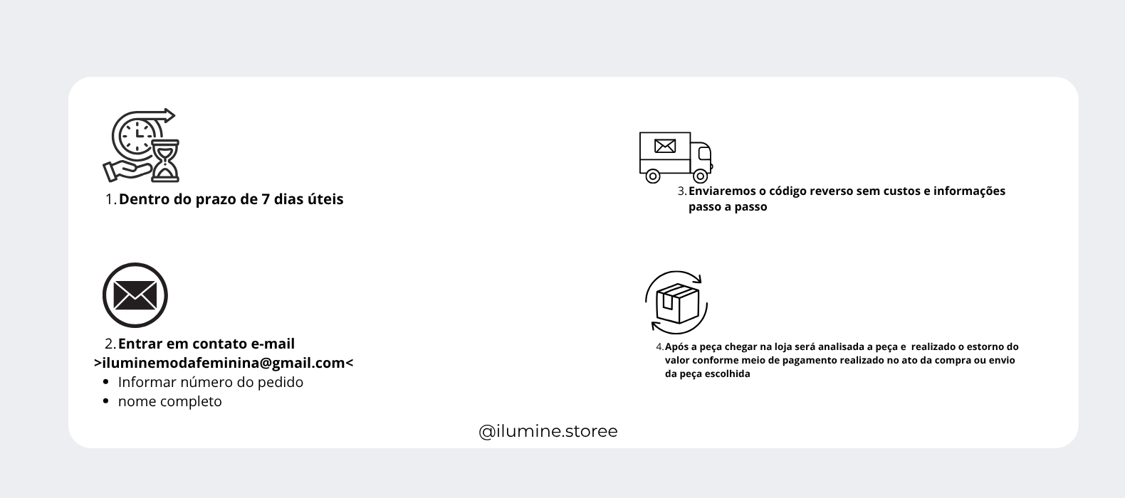 - O produto deve ser encaminhado de preferência na sua embalagem original, para que você não arque com custos adicionais ou você pode usar qualquer embalagem que você tenha, desde que a peça não fique visível e esteja protegida durante todo o percurso.